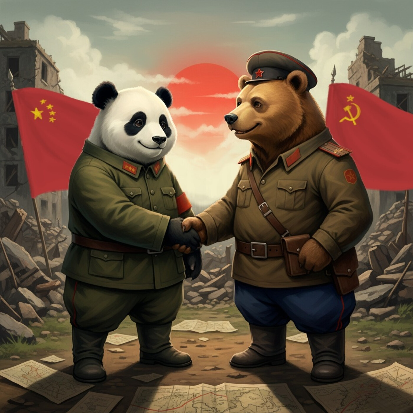 На переднем плане изображены панда (символ Китая) и бурый медведь (символ России), крепко пожимающие друг другу лапы. В их взглядах читается решимость и надежда. Панда выглядит серьезной и сильной, а медведь - могучим и непоколебимым.