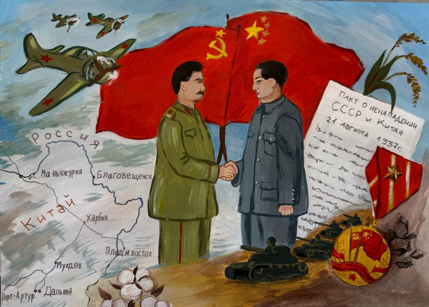 Пусть живет и крепнет нерушимая ДРУЖБА и СОТРУДНИЧЕСТВО СОВЕТСКОГО И КИТАЙСКОГО НАРОДОВ! Еще 21 августа 1937 г. был подписан советско-китайский договор о ненападении. "Русский с китайцем - братья навек" - слова из старой китайской песни, которая очень нравилась Иосифу Сталину.