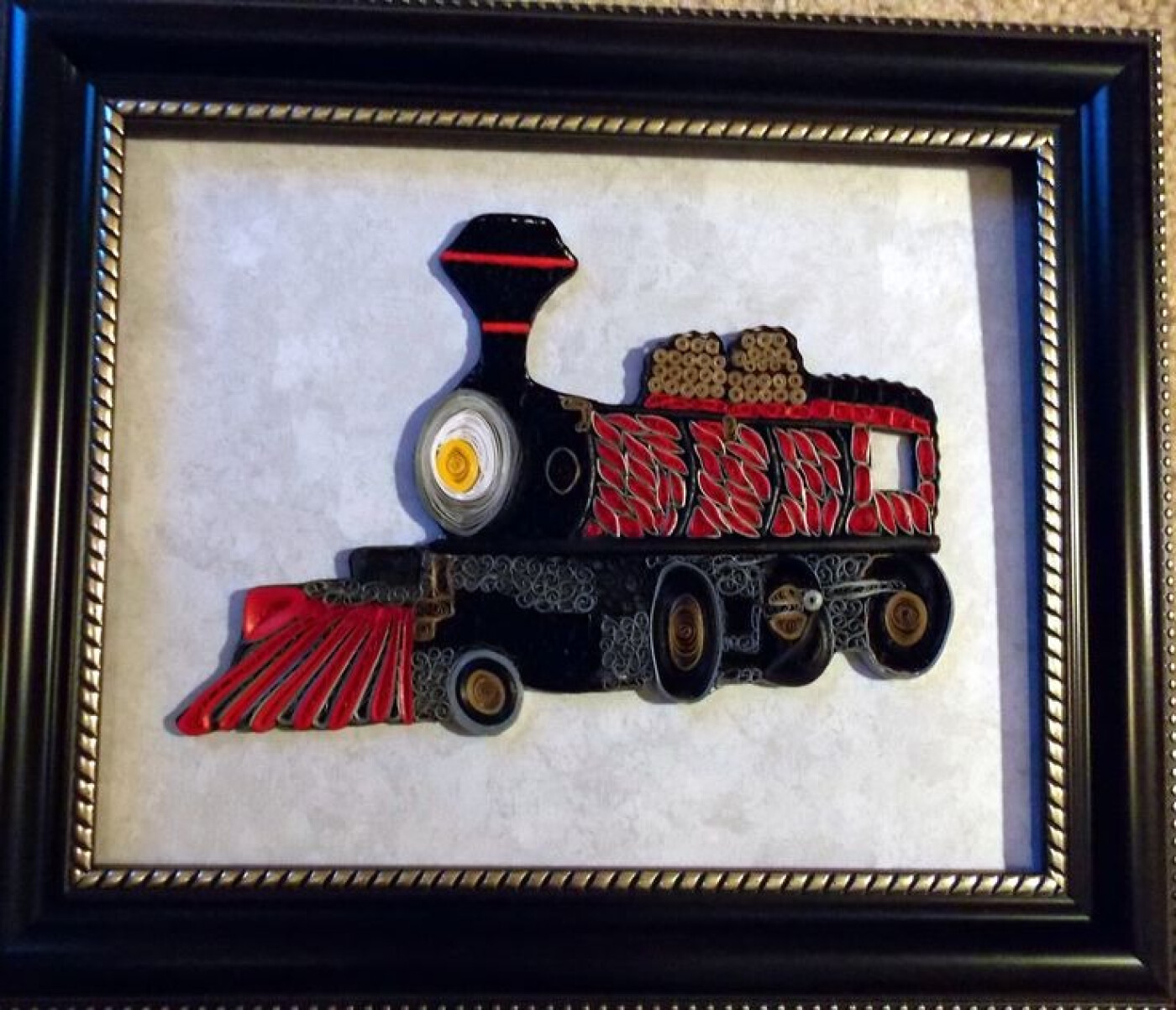 На моей работы представлена декоративная рамка, внутри которой находится миниатюрная поезд. Поезд выполнен в черно-красной цветовой гамме.