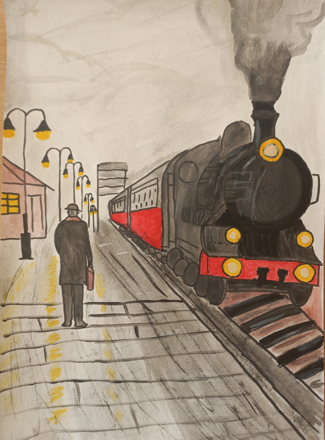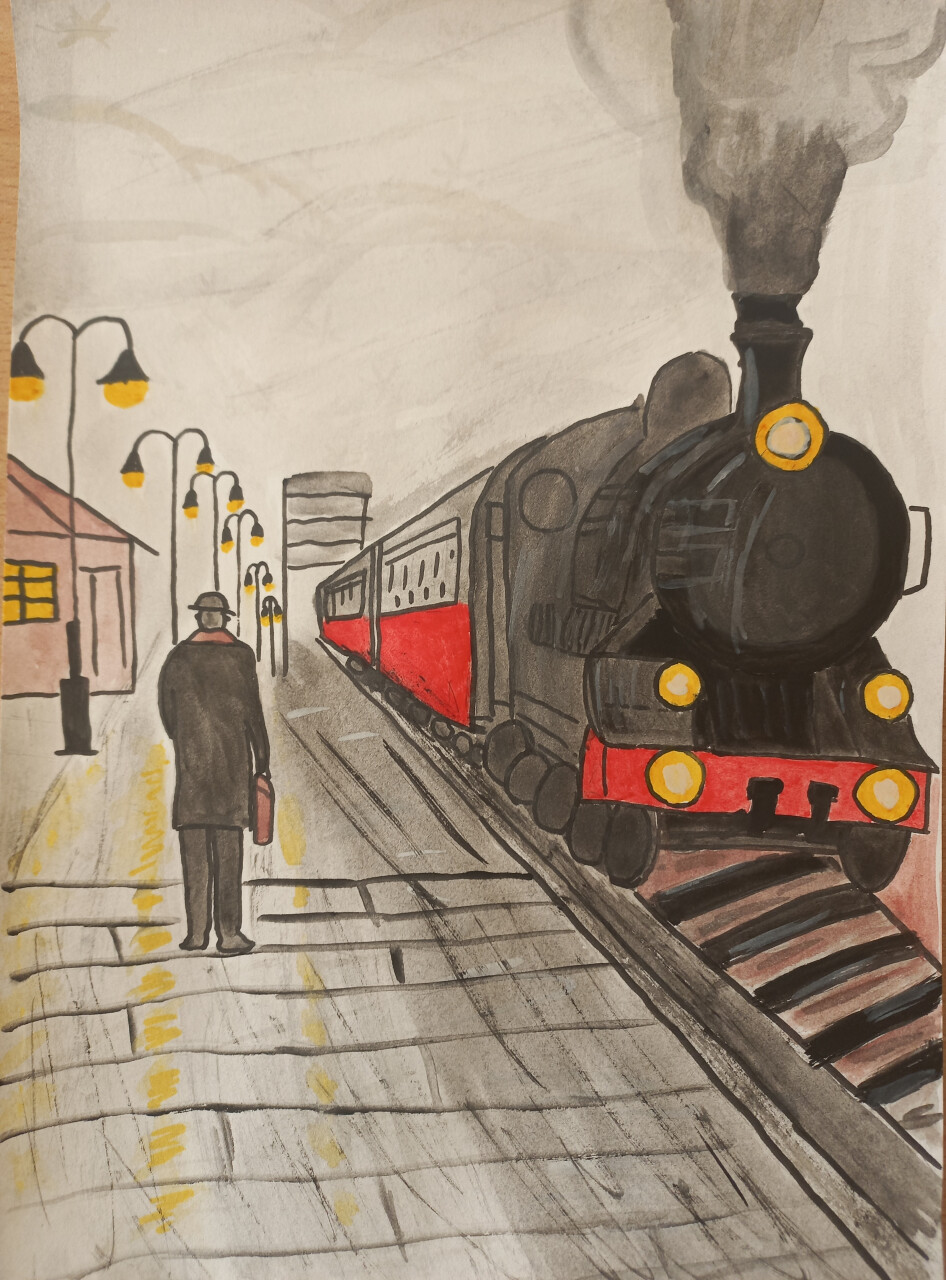 "Поезда, поезда мчатся вдаль непрерывно..." Работа выполнена карандашом и акварелью. Поезд следуют по расписанию, жизнь движется вперед, не останавливаясь.