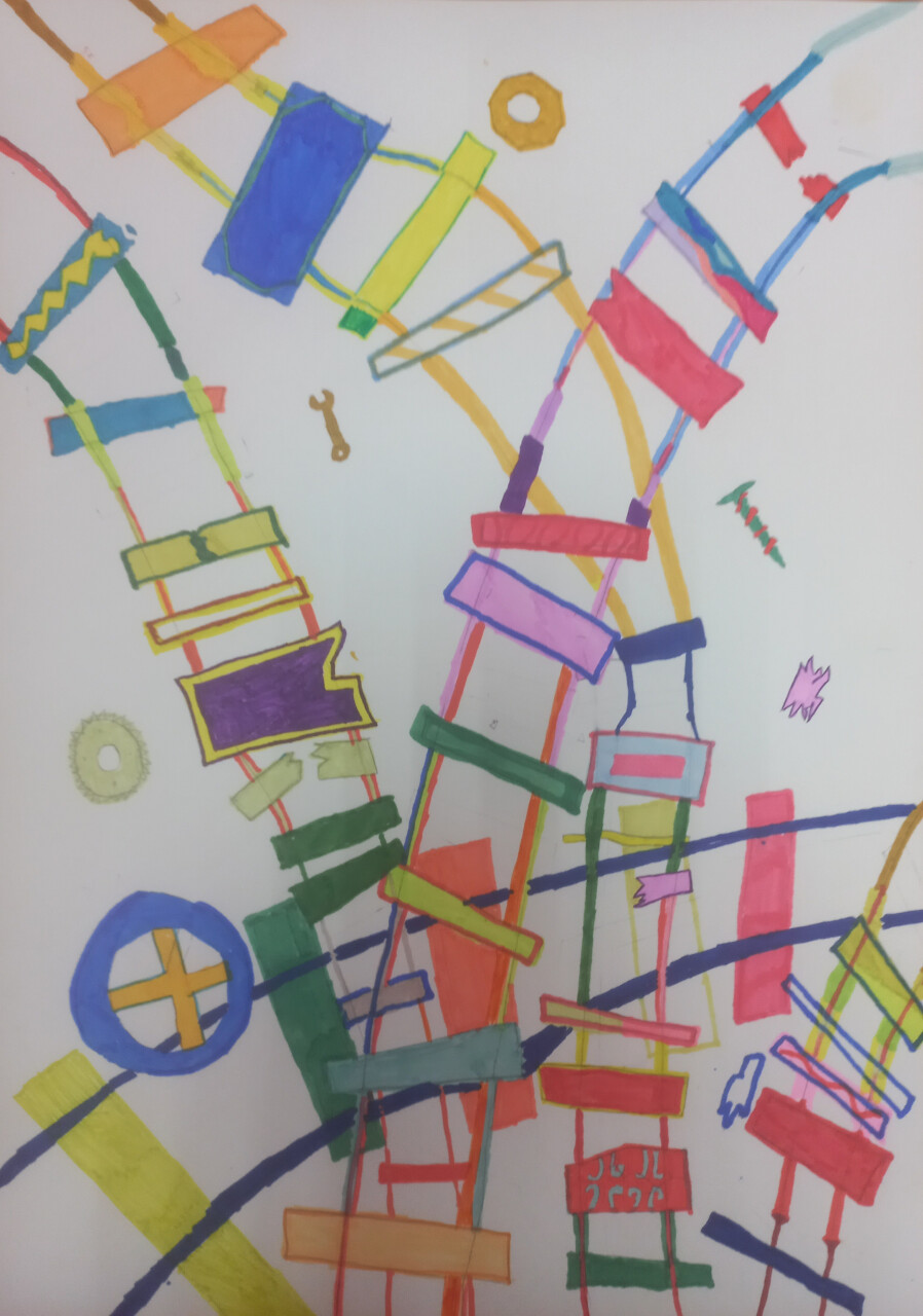 Работа выполнена маркерами учеником 1 класса ДШИ. По мотивам железной дороги выполнена эта динамическая композиция.