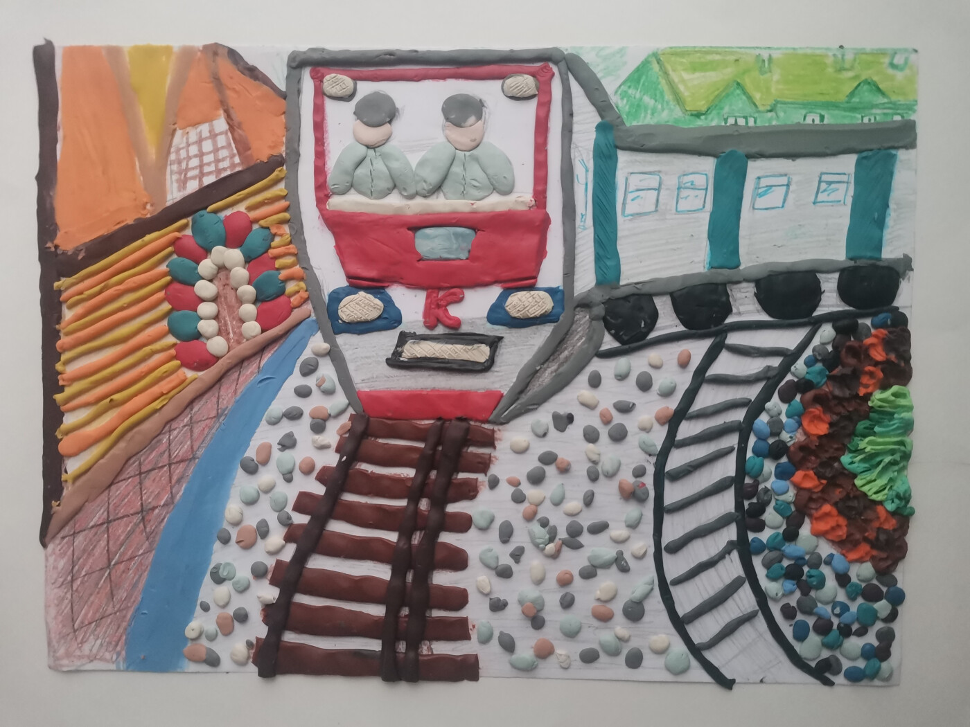 Эта работа, летнее воспоминание об уникальном аттракционе нашего города . Прогулочный поезд «Стрела» Юго-Восточной детской железной дороги находится на станции «Задоринка». Данная работа выполнена в технике «Пластилинография».