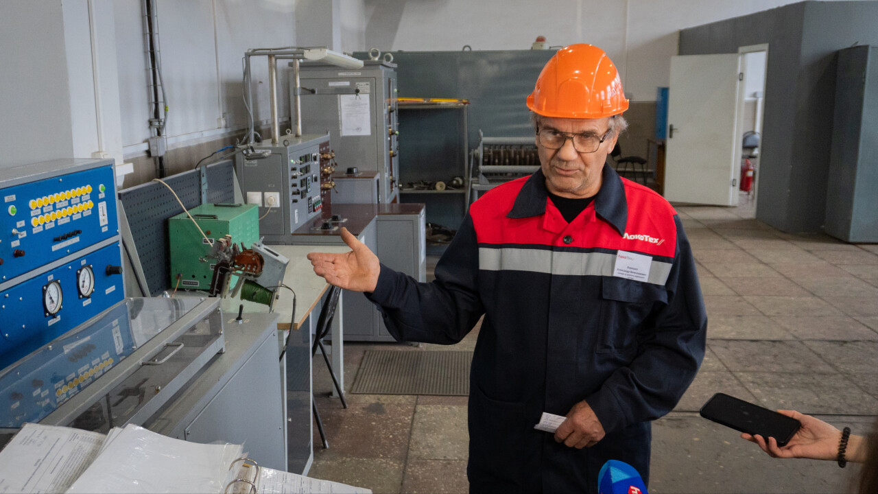 На фотографии запечатлен работник железной дороги, демонстрирующий свое место работы