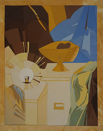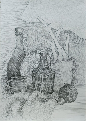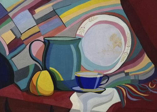 Во время написания этого натюрморта объекты в помещении освещались теплым светом, благодаря которому раскрылся весь спектр цветовых оттенков. Видно, как теплые и холодные оттенки перекликаются друг с другом, придавая интересную гамму цветов, так же есть очень много бликов по всему натюрморту, и чем дальше предметы от источника теплого света, тем они становятся с более холодным под тоном.