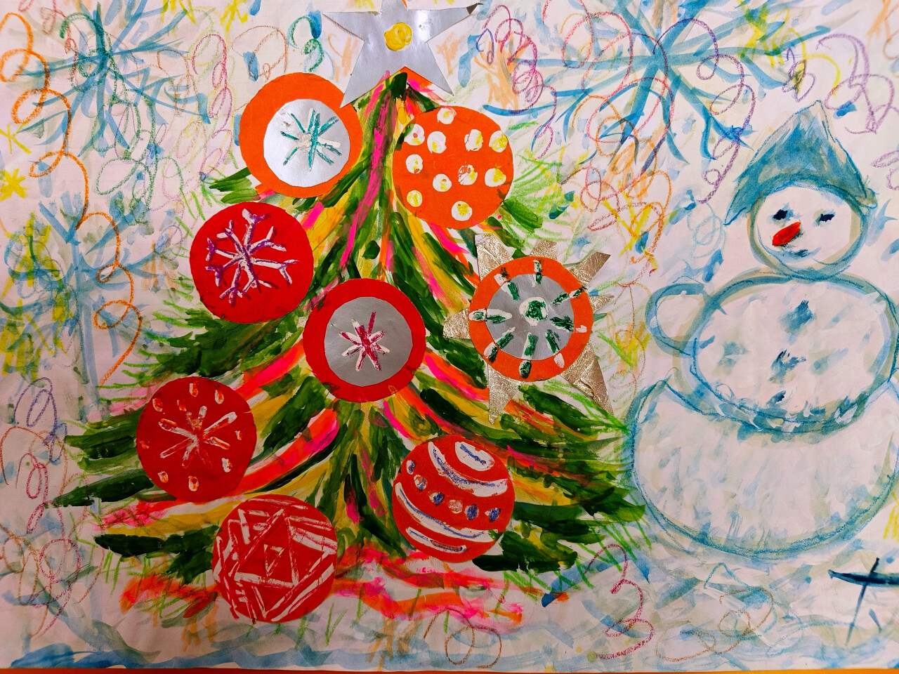 работа выполнена акварелью, восковыми мелками и с элементами аппликации