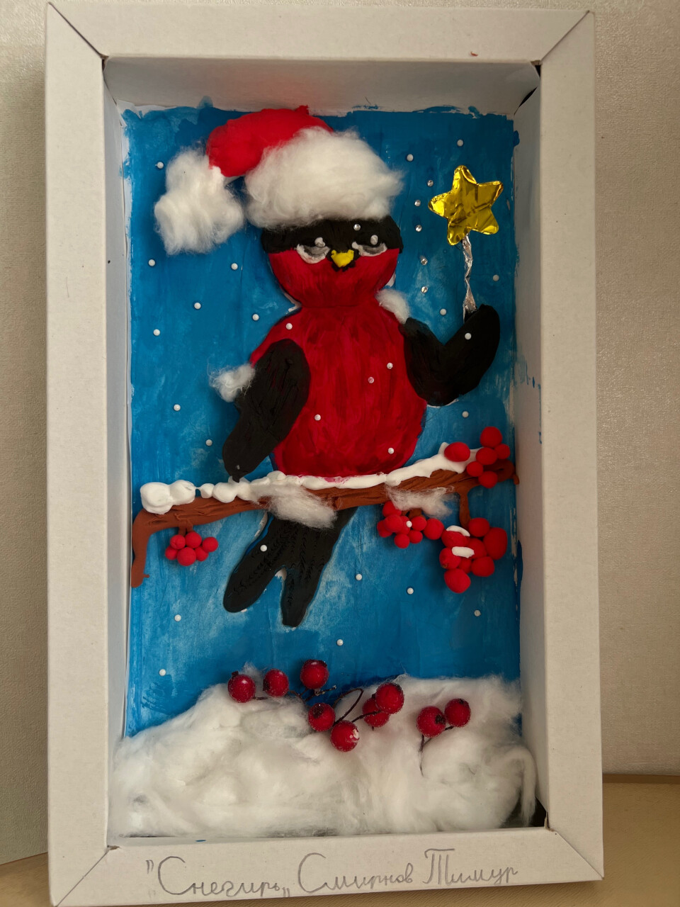 Картина выполнена с помощью пластина, красок и новогодних декораций