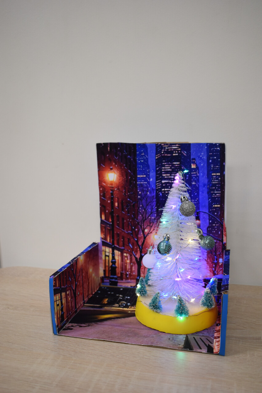 Работа выполнена из смешанных материалов (мишура, картон, бумага), украшена гирляндой.