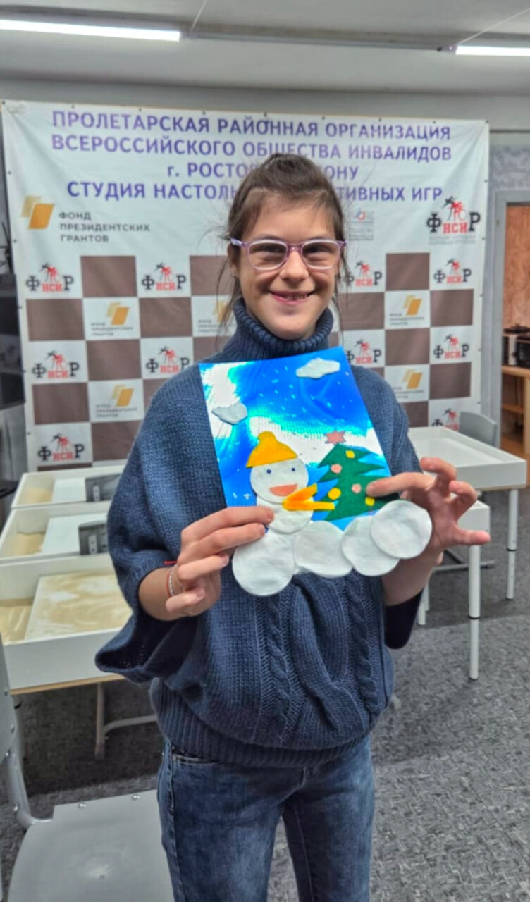 В праздничном ожидании наступающего Нового 2026 Года Валерией была создана эта чудесная аппликация с весёлым снеговиком у нарядной ёлки.