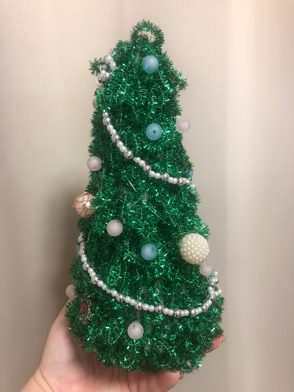 Представлена работа «Зеленая красавица», выполнена из синельной проволоки, с элементами украшений