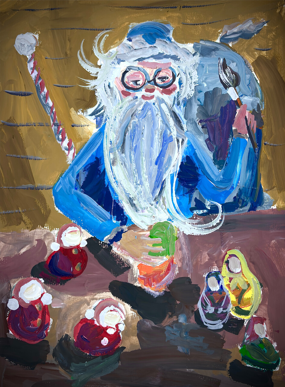 Дедушка Мороз украшает в подарок традиционные игрушки-неваляшек и матрешек