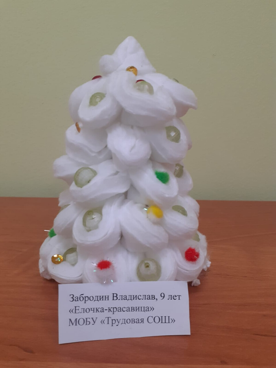 Работу выполнил ученик 2 класса Забродин Владислав совместно с классным руководителем Биркеновой Л.В. "Елочка-красавица" сделана из ватных дисков, клея, украшений.