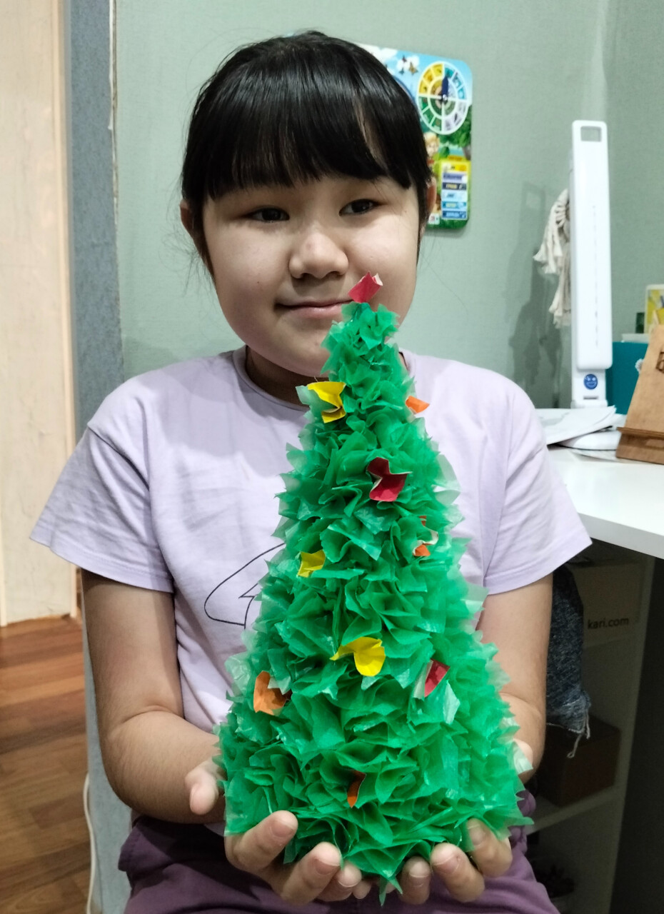 Это произведение создано Олесей Хабибуллиной, ребёнком с инвалидностью. В работе использованы пластилин, картон, зелёный целлофановый пакет и цветная бумага.