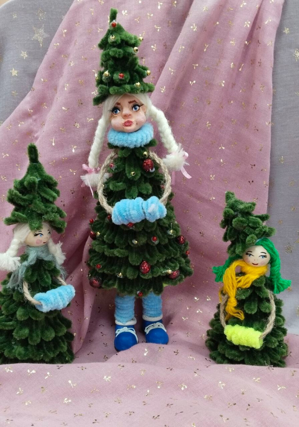 Новогодняя композиция выполнена из картона, полимерной глины и синельной проволоки.