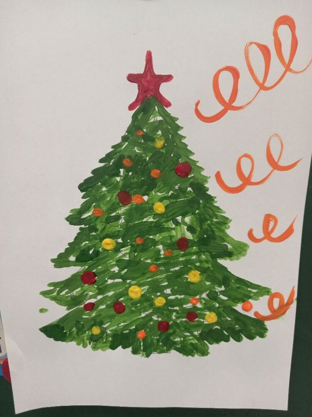 Девочка с тяжелым диагнозом УУО ( 2 вариант программы), с помощью педагога нарисовала гуашью ёлочку.