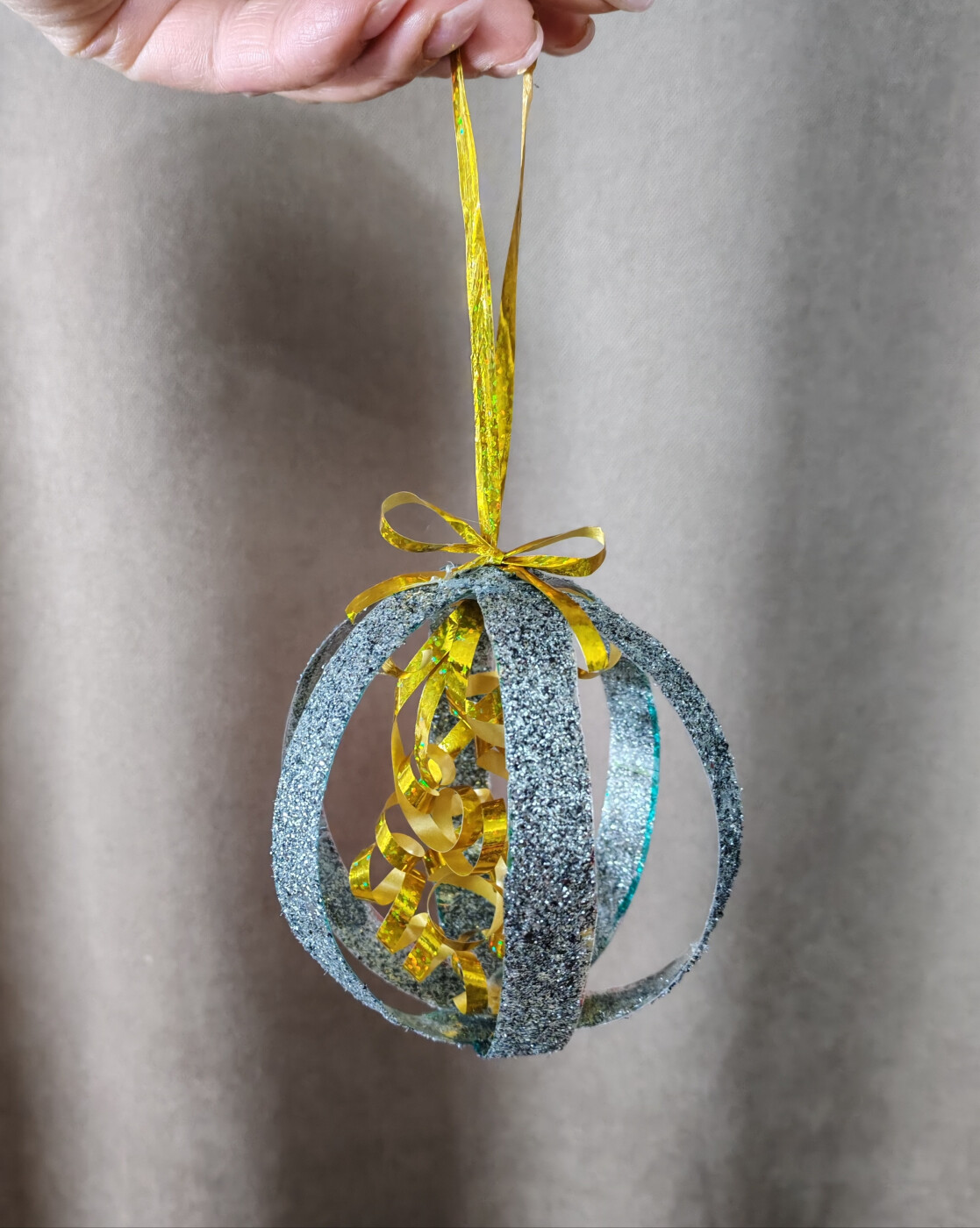 Праздничный шарик изготовлен из пластинкой бутылки, нам понадобилось клея ПВА, блёстки, клей пистолет, лента и ножницы.