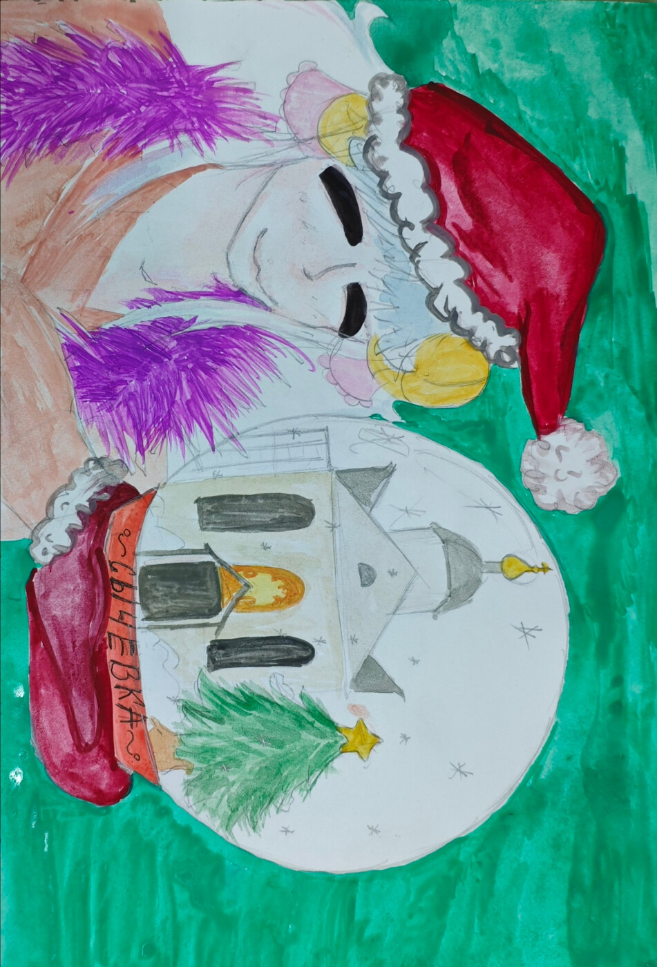 Рисунок выполнен Ариной Матвеевой. Ученица 8б класса. Ребенок-инвалид. На нём изображён волшебный город в руках у героя в новогоднем касплее.