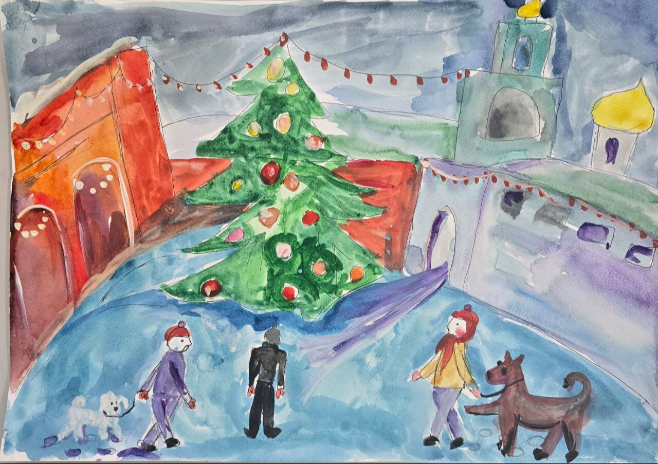 Этот рисунок переносит нас в преддверии новогодних праздников, где ощущается особое, торжественное ожидание чуда. В центре внимания – величественная ёлка, установленная у стен старинного храма. Её пышные ветви украшены мерцающими огоньками и праздничными шарами, которые отражают свет фонарей и мягкое свечение, исходящее от храмовых окон.