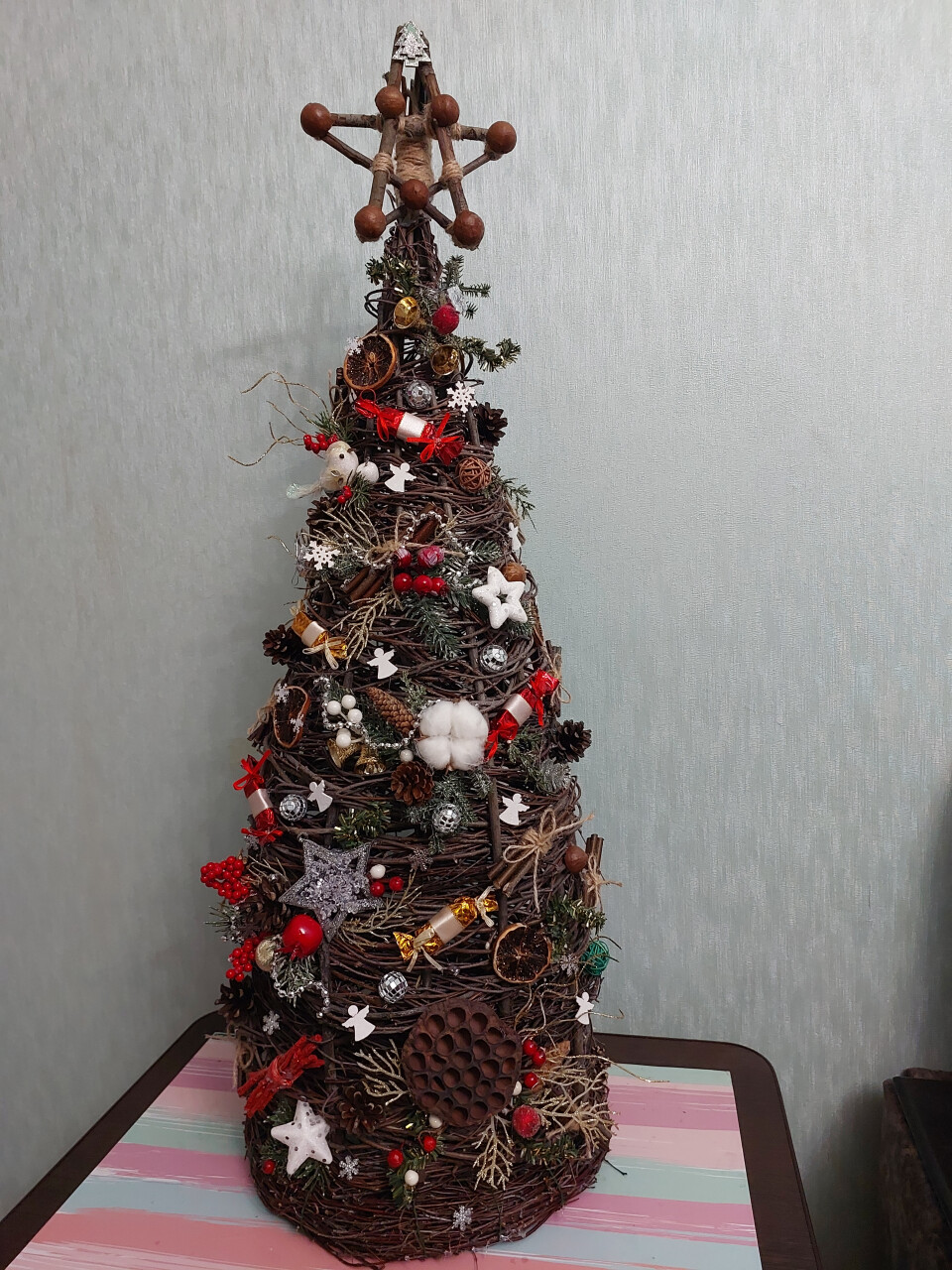 Вверху елки звезда из веточек и скорлупы орехов.По всей елочки креативные, творческие разнообразные сюжетные элементы декора не похожие друг на друга.