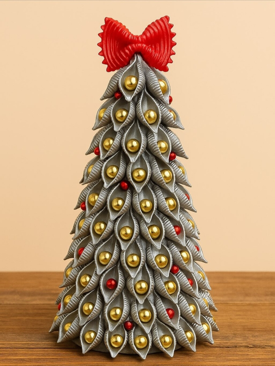 Когда вся ёлочка «обрастала» макаронами, мы взялись за краски. Я выбрал серебряную. На макушку приклеили макаронину - бантик, и украсили елочку бусинами.