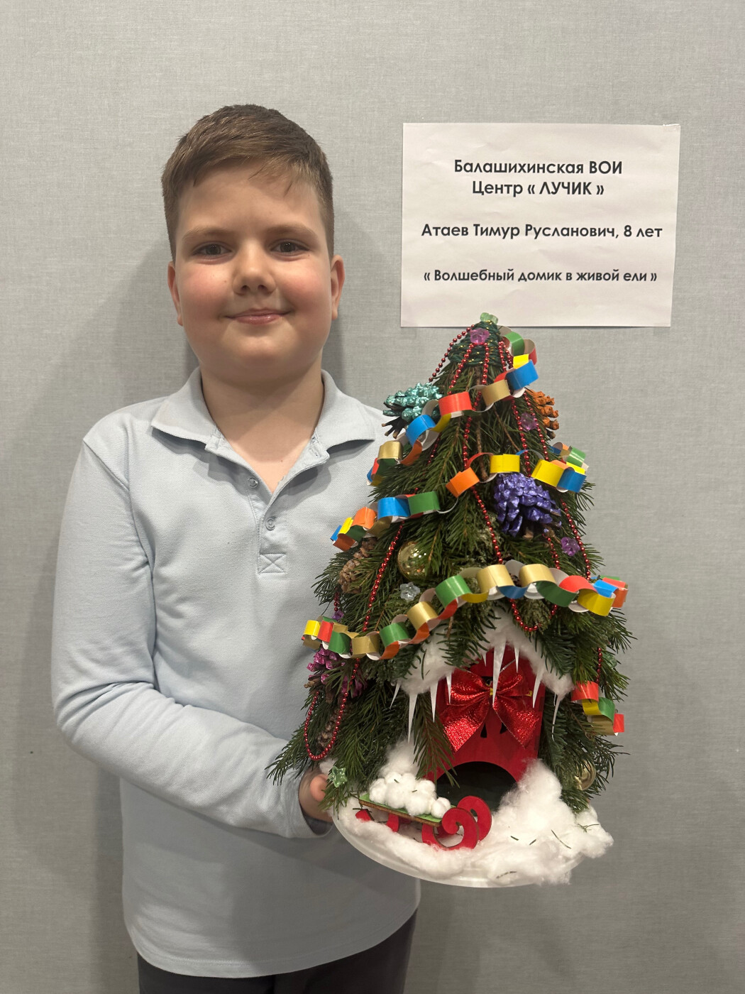 Тимур с мамой собрали в лесу ветки ели и шишки. Над домиком при помощи клея смастерил елочку, разукрасил шишки, сделал из цветной бумаги гирлянду. Украсил новогоднюю елочку гирляндами , шариками и разноцветными шишками.Из ваты скатал снежки и снежок, на крышу домика приклеил сосульки из бумаги . Вот такой волшебный домик в живой ели получился.