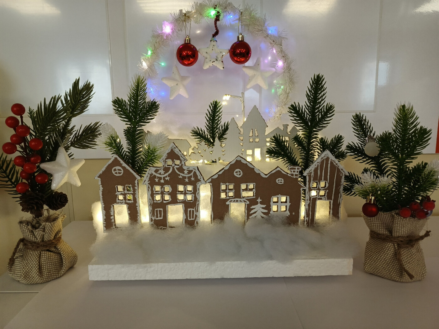 Для создания нашей конкурсной работы мы использовали разнообразные материалы: картон, пенопласт, искусственные еловые ветки, гуашь, синтепух, ёлочные игрушки, мишуру и светодиодные ленты.
