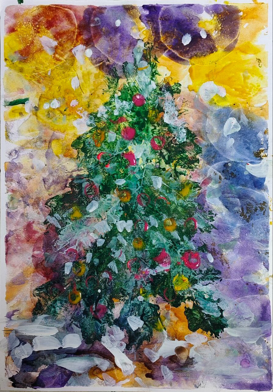 "Новогодний карнавал красок", работа выполнена мальчик 7 лет с аутизмом. Рисовал несколькими предметами(стаканчики, листья деревьев и трубочки)