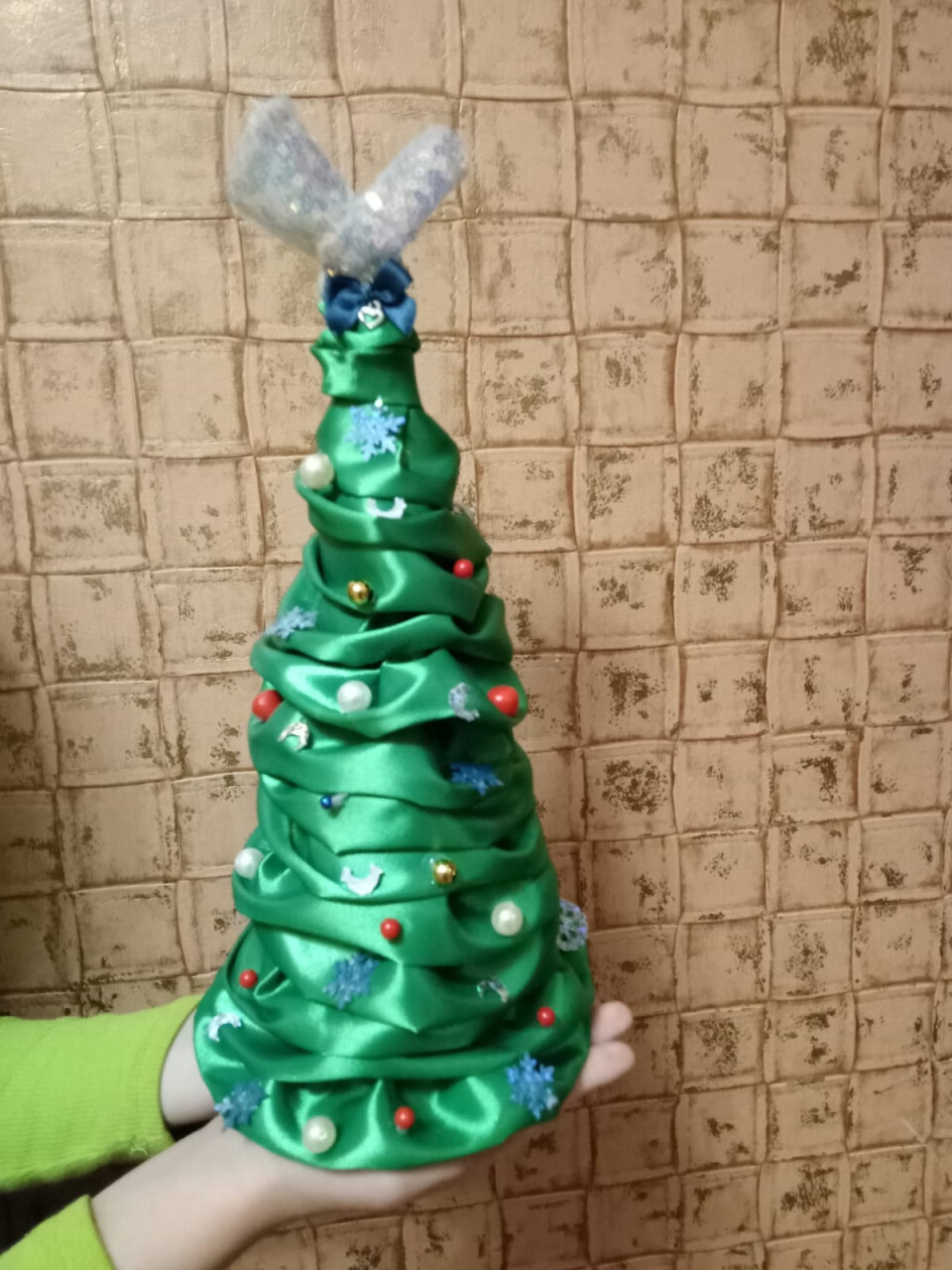 Елочка сделана из атласа и украшена декоративными бусинками.