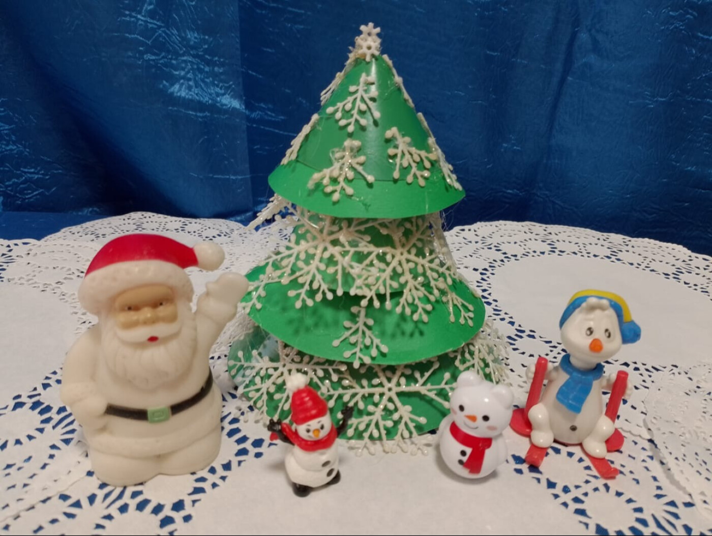 Ёлочка выполнена из картона. Собрали и соединили 4 конуса в единую конструкцию. Ёлочка украшена снежинками для создания зимнего настроения, придания работе ажурности, "колкости". Фон: снежный покров - это салфетки, вечернее небо - полотно синего цвета. К Ёлочке пришел Дед Мороз, он предлагает гостям полюбоваться лесной красавицей, отпраздновать Новый год вместе с ней.