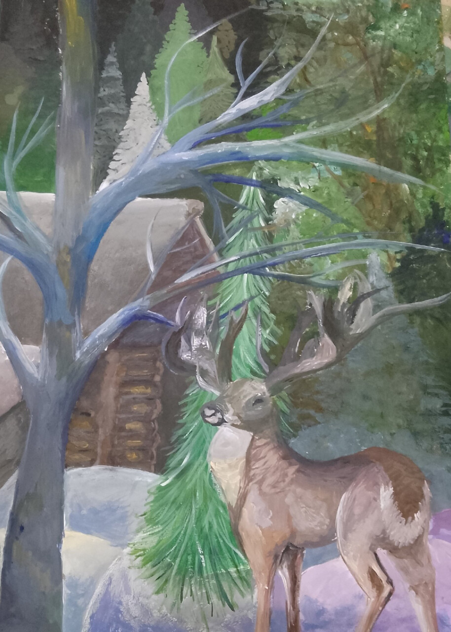 На этом рисунке изображён домик в нашем небольшом городе Бологое,к которому пришел лось,чтобы посмотреть на новогодний праздник