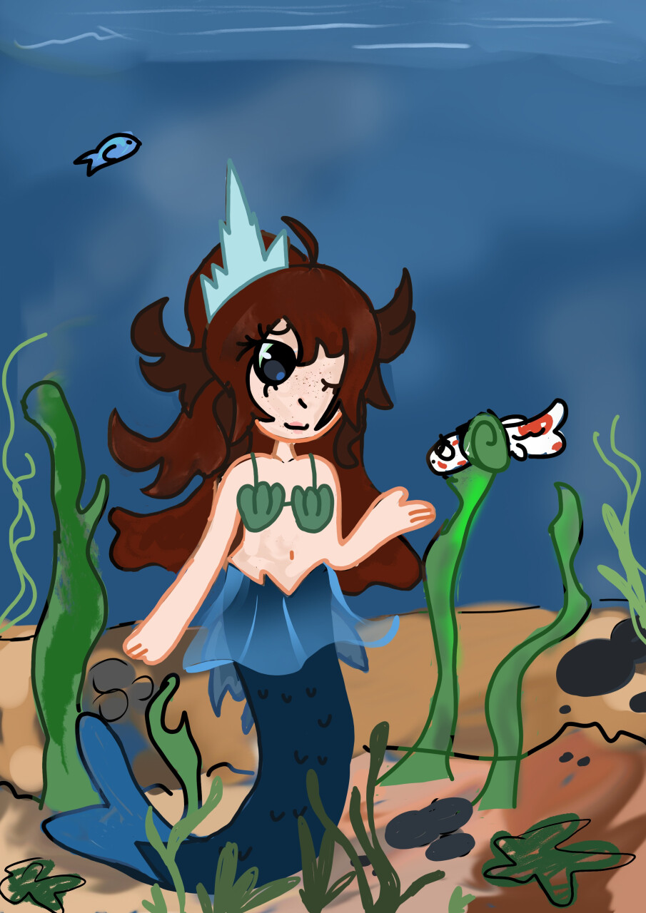 Когда я рисовала эту картину, я вдохновилась морем и сказками про русалок. Я люблю придумывать истории о том, как герои помогают друг другу и становятся настоящими друзьями. Мне хотелось показать, что даже маленькая рыбка может найти защиту, а добро всегда возвращается дружбой.