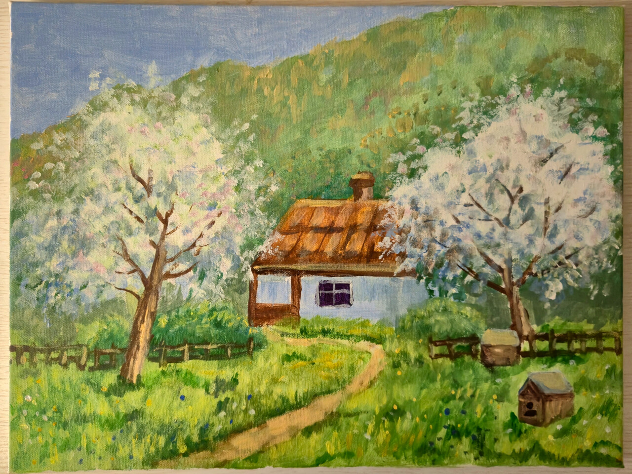 Мой милый домик в деревне. Он утопает в цветах деревьев и запахе весны! Акрил, холст.