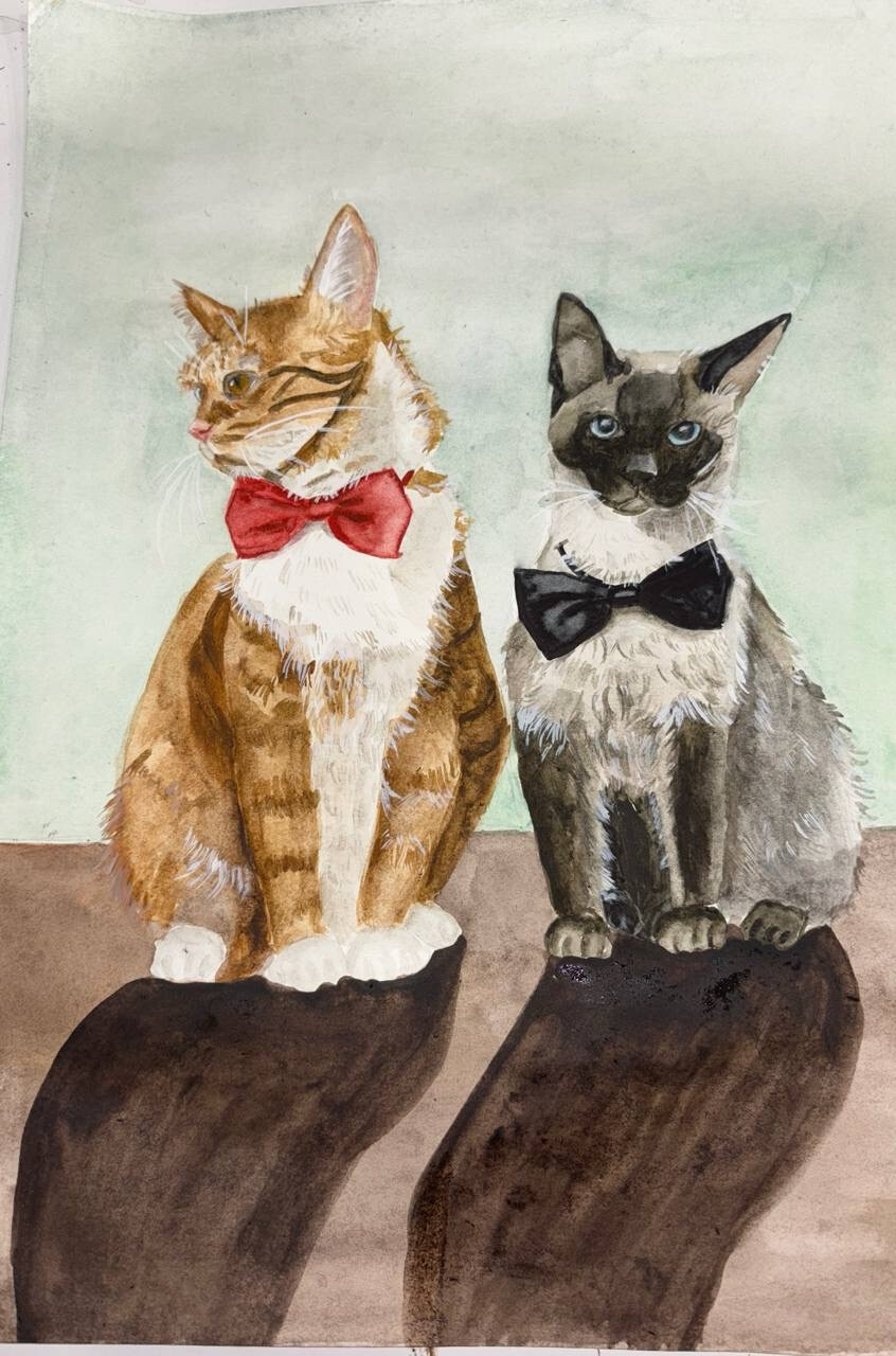 Эта работа пропитана моей любовью к моим домашним питомцам. Рыжего кота зовут лаки, серую кошечку — Пушинка.