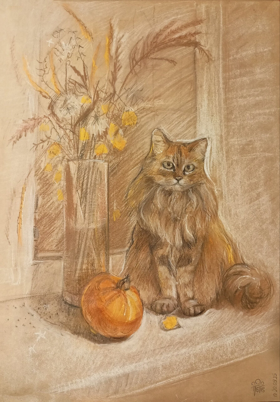 На работе изображена кошка по имени Киша, первая за год тыква и сухоцветы. Целью её выполнения было изобразить любимого питомца, передав его отличительные черты, а также предметы характерные для осенней поры, которыми выступили тыква и высушенный букет цветов и трав. Так как Киша имеет коричнево-рыжеватый окрас, все три предмета натюрморта в одной цветовой гамме, из-за чего было принято решение выполнить работу в этой палитре.
