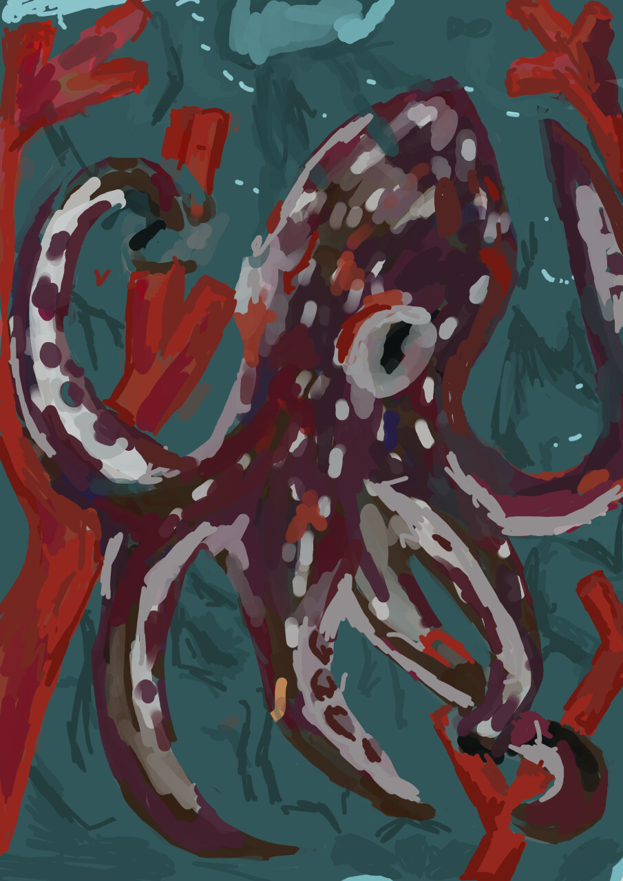 Я вдохновилась сказками про дружбу и волшебство. В морской теме это рисовать было в два раза увлекательнее. Меня всегда привлекали яркие сказочные образы и необычные существа, поэтому в моей картине появился красный осьминог.