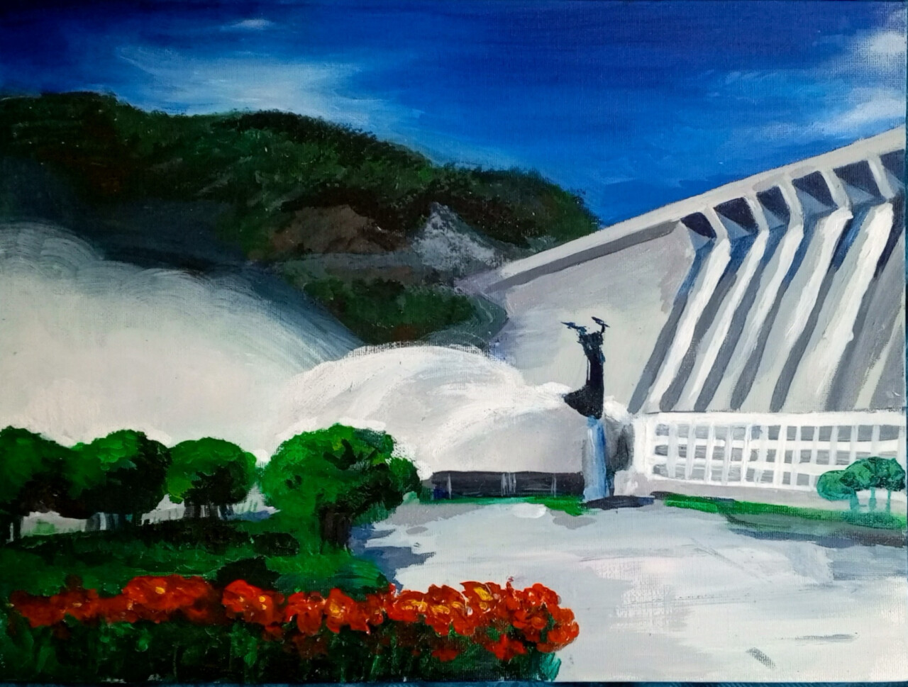 Я родилась в маленьком дальневосточном городе Зея, в котором построена величественная Зейская ГЭС, снабжающая электроэнергией не только часть Дальнего Востока, но и Китай. Образованное в результате перекрытия реки водохранилище очень большое, красивое, иногда из-за большой приточности рек выше ГЭС, угрожает бесперебойной работе объекта электроэнергетики. Чтобы этого не происходило, иногда открывают шлюзы. Вот именно это грандиозное зрелище я и изобразила. Чтобы посмотреть на бурлящую в падении воду, образовавшуюся в брызгах радугу съезжается посмотреть весь город