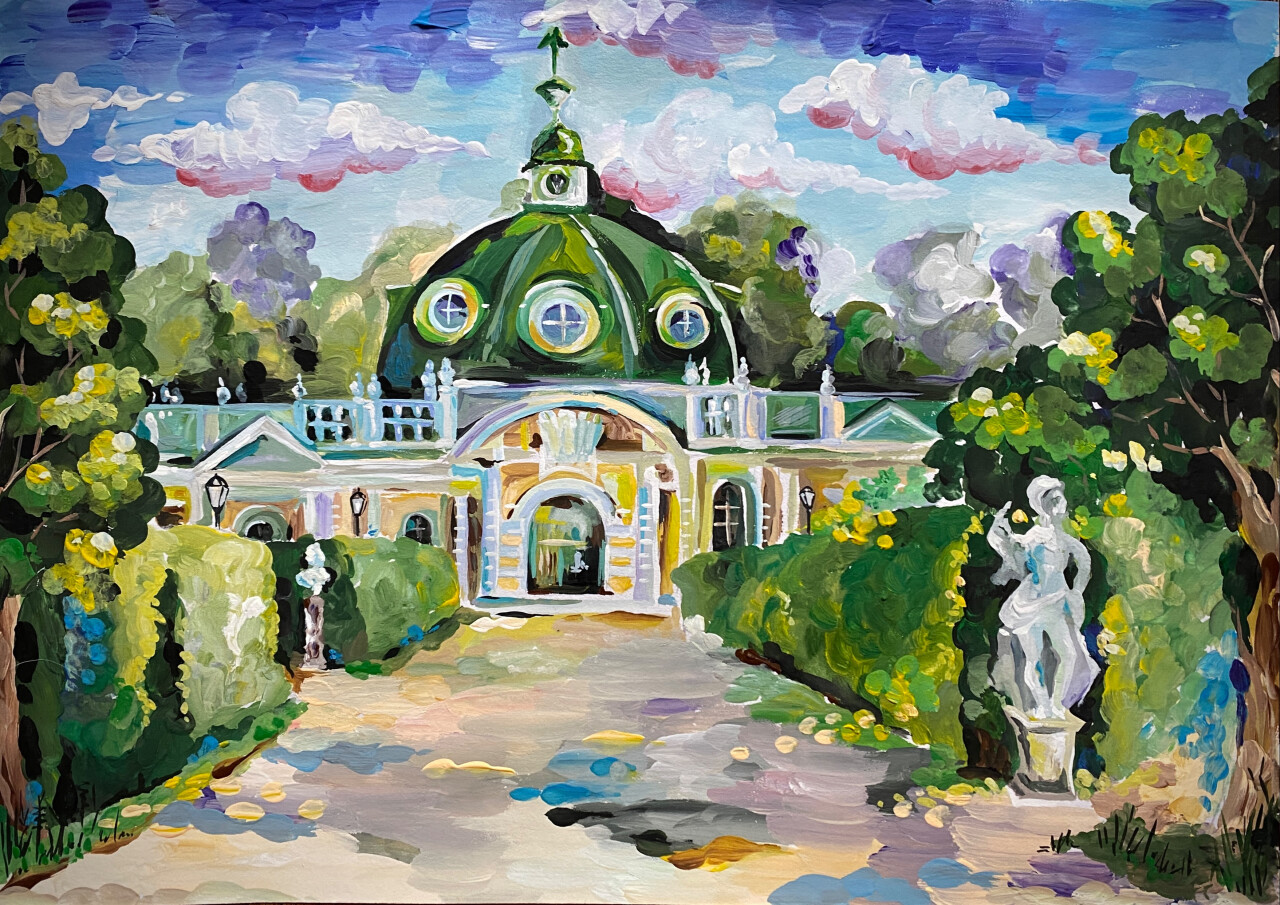 Работа выполнена на формате А3 гуашью. Изображен любимый грот в усадьбе Кусково