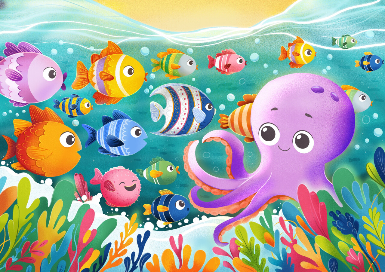 В прозрачной воде, искрящейся от солнечного света, плавает стайка разноцветных рыбок всех форм и размеров. Тут и полосатые, и пятнистые, – настоящее карнавальное "шествие"! Среди них выделяется улыбающийся осьминог. Он словно дирижер, окруженный красочными кораллами и водорослями.