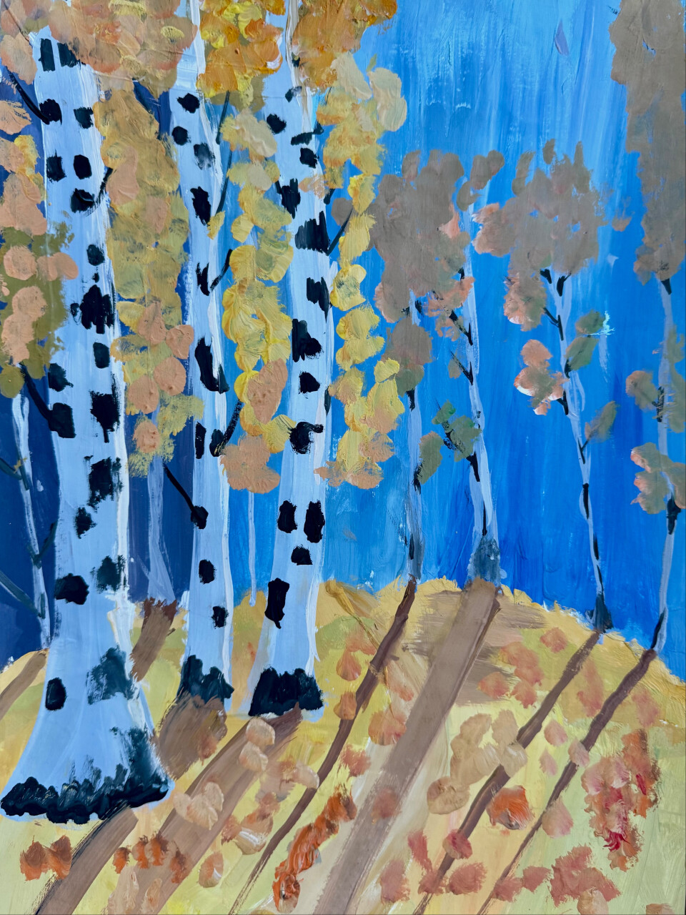 Я живу в очень древнем и живописном городе - Арзамас. У моего дома есть небольшой пруд, а вокруг него - березовая роща. Осенние деревья мне особенно нравятся, а когда дует ветер, то танец золотых листьев просто завораживает. Мое настроение становится одновременно радостным и немного грустным. Я постаралась передать красоту нашей березовой рощи и свои чувства в этой картине.
