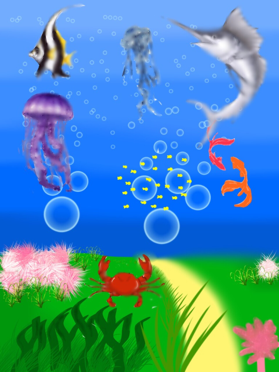 Моя работа выполена в стиле " цифровая живопись" на планшете.Назавание мой работы:"Тайны моря".На рисунке изображено морское дно с его обитателями.