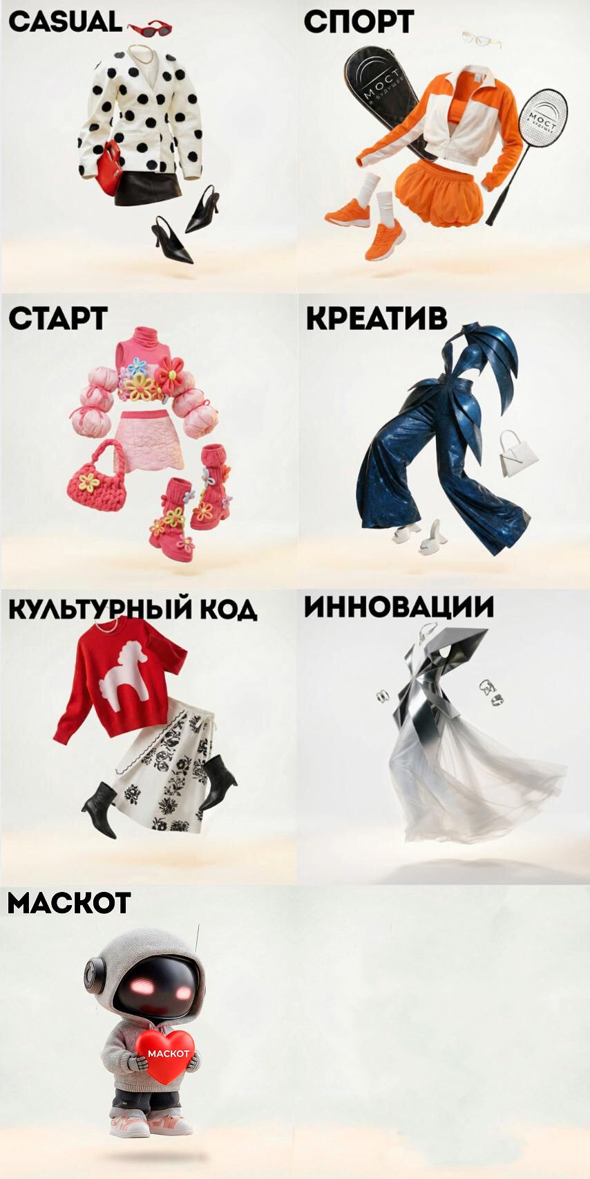 Энергия движения Там, где стиль встречает динамику, рождается спорт. Это одежда для тех, кто привык выигрывать каждый свой день. Твоя задача — совместить эстетику города и мобильность, сделать спортивные элементы частью модного нарратива. Представь мир, где каждый образ готов к стремительным переменам и новым возможностям, а комфорт — это не повод жертвовать выразительностью.