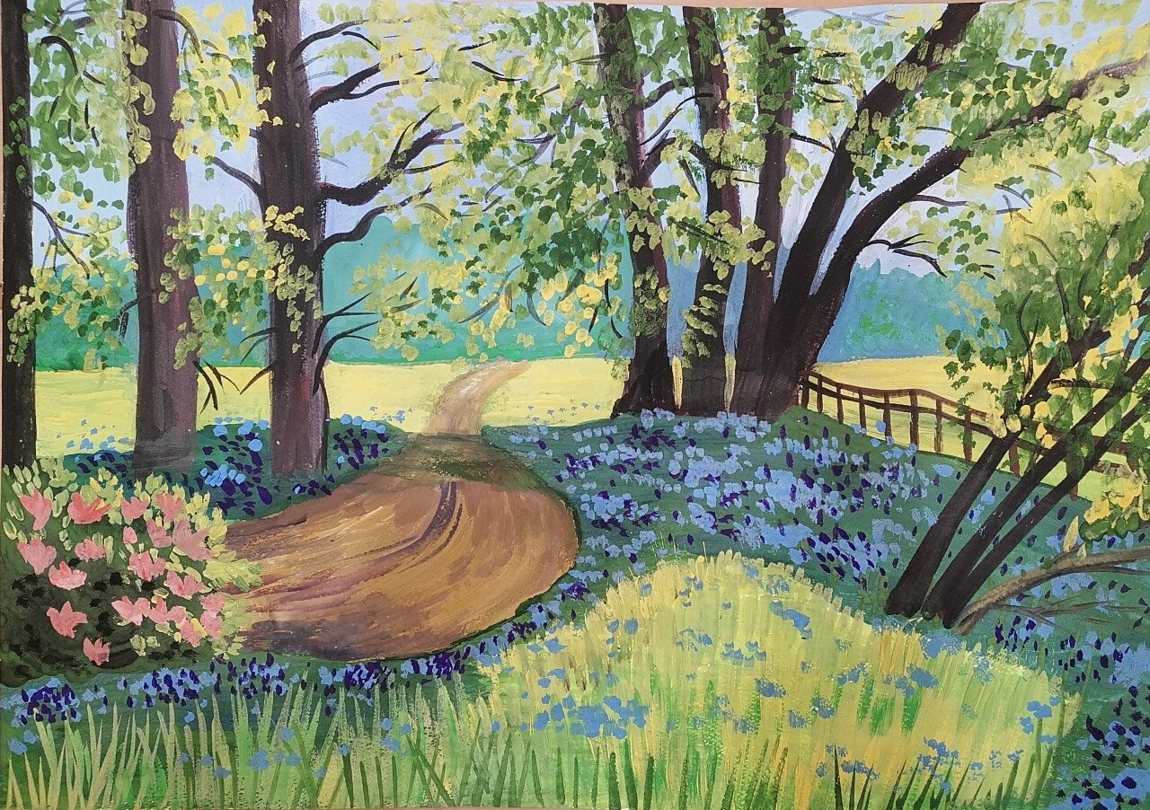 Мы с семьёй любим отдыхать на природе: ездить в деревню к родственникам, гулять в лесу, купаться на речке. Среди природы я отдыхаю душой! В своей работе я постаралась передать летний солнечный денек в лесу, игру света и теней, прекрасные деревья с изящными ветвями и яркой листвой, извилистую дорогу, убегающую в лес, голубые колокольчики и куст розового шиповника. Работа наполняет дом светом, теплом, радостью и умиротворением.