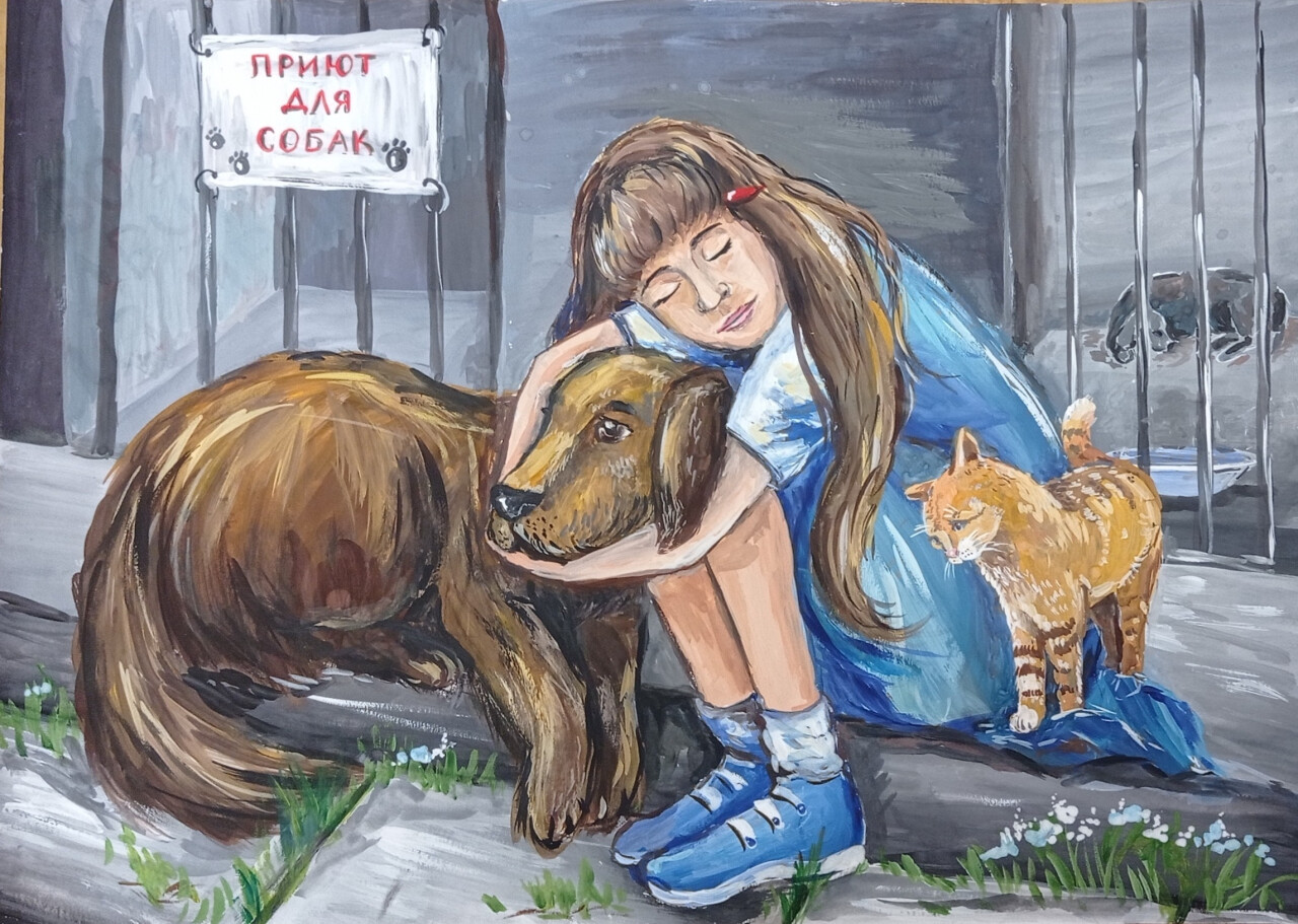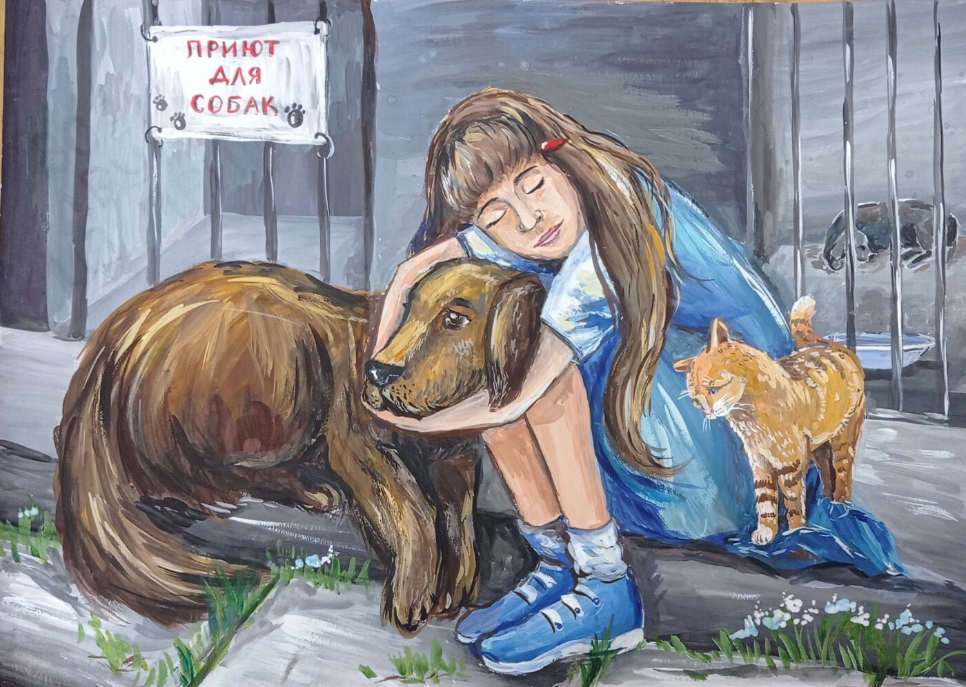 На картине нарисована девочка с собакой, которую она забрала к себе домой из приюта. Эта работа призывает людей к гуманному отношению к бездомным животным.