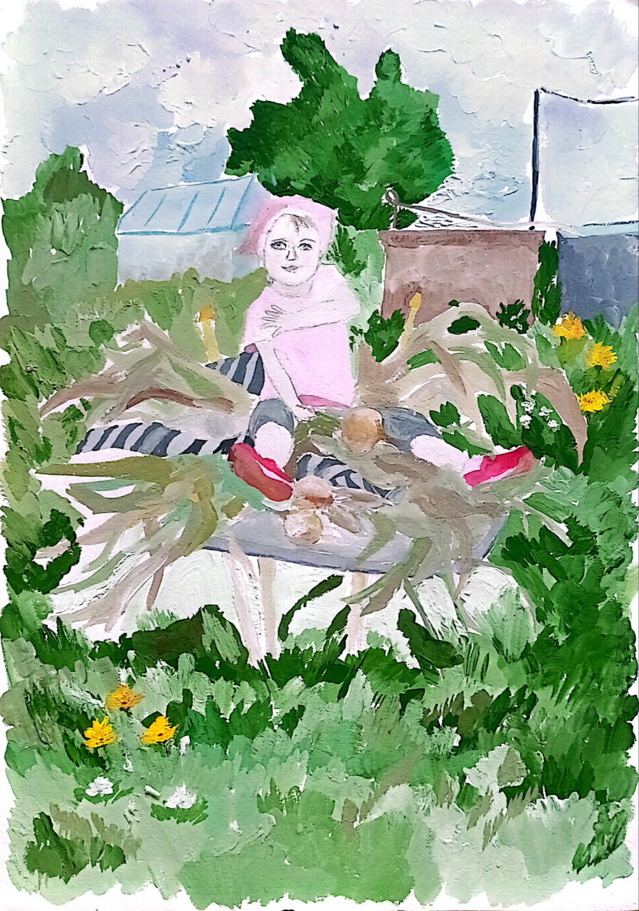Замысел моей работы заключается в том, что я хотела передать атмосферу деревенской жизни. Окружающая природа, постройки и поза девочки создают ощущение уюта, покоя и гармонии с окружающим миром. Героиня является частью пейзажа: она сидит на одеяле среди травы и цветов, что подчёркивает её связь с природой. Пришло время сбора урожая. И вот в руках она держит луковицы, которые только что выдернула из земли. Яркие детали одежды (красные туфли, розовый платок и футболка) контрастируют с зелёными и синими оттенками природы и построек. Несмотря на пасмурное небо, картина не выглядит мрачной. Она передаёт спокойное, немного задумчивое настроение. Таким образом, я постаралась показать тёплый, искренний образ детства на фоне родной природы.
