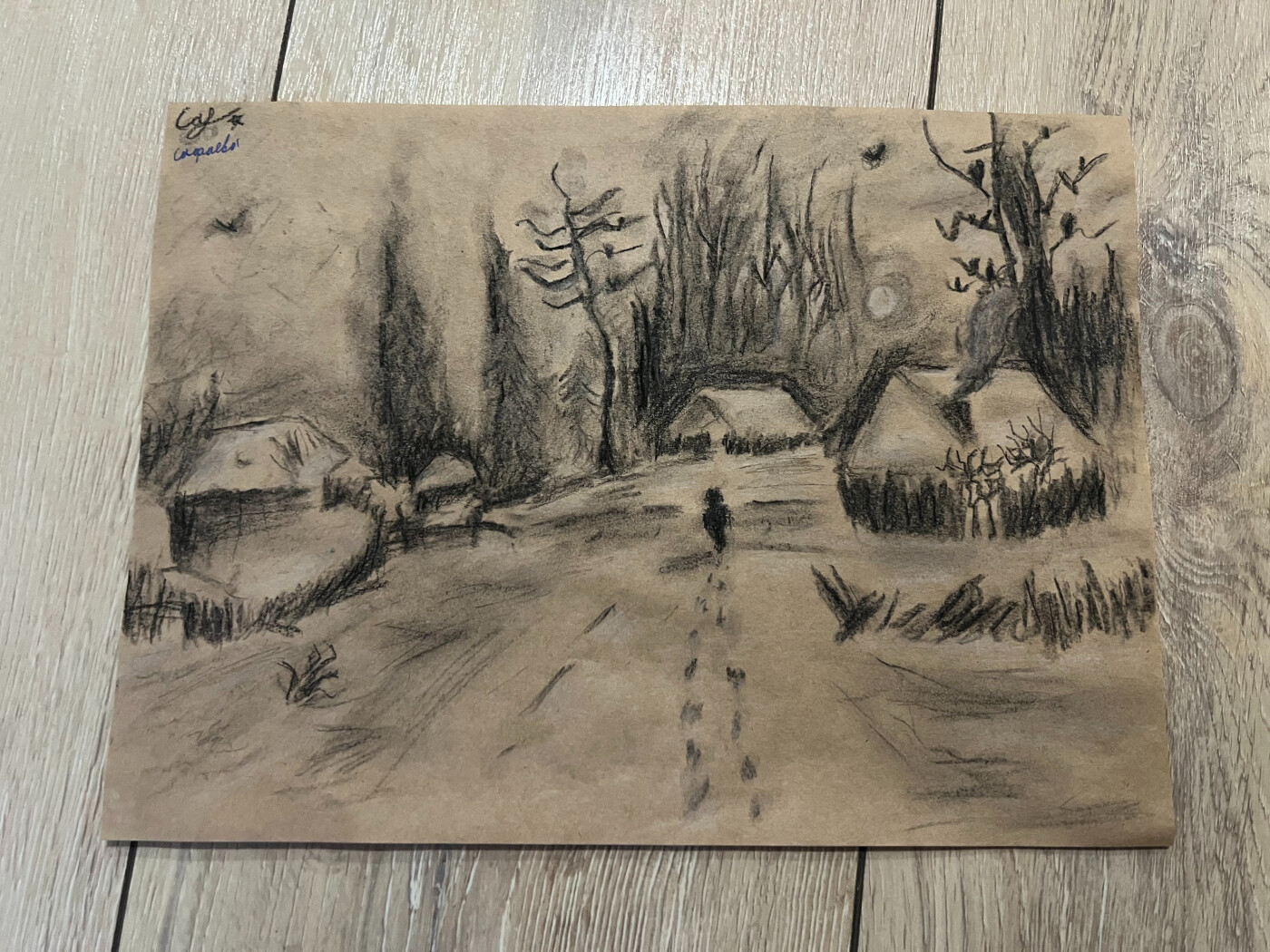Моя любимая деревня, 2026, бумага, уголь, 40х30, 11 лет.