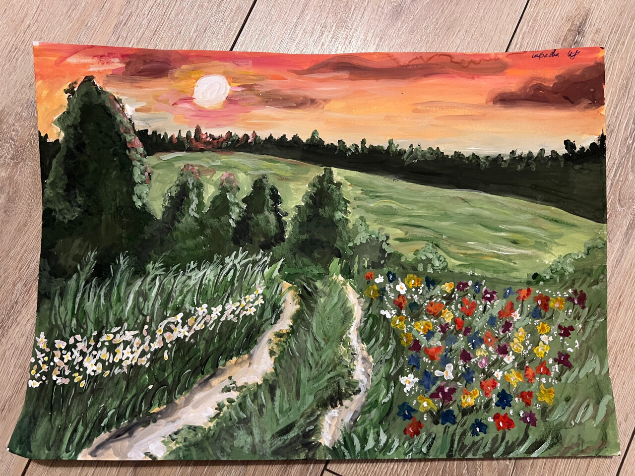 Закат в любимой деревне, 2026, гуашь, 30 на 40, 14 лет.