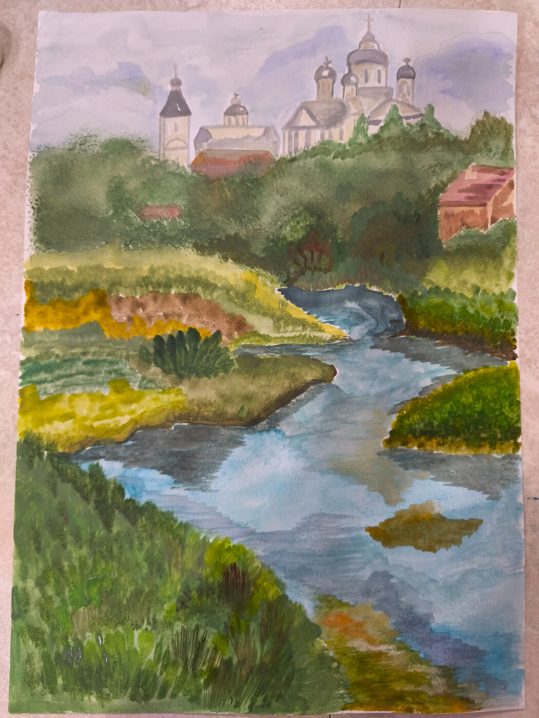 Вид на речку Теша, Выездновские луга. 2025г. Бумага, акварель, 9 лет. Размеры: 297 на 420