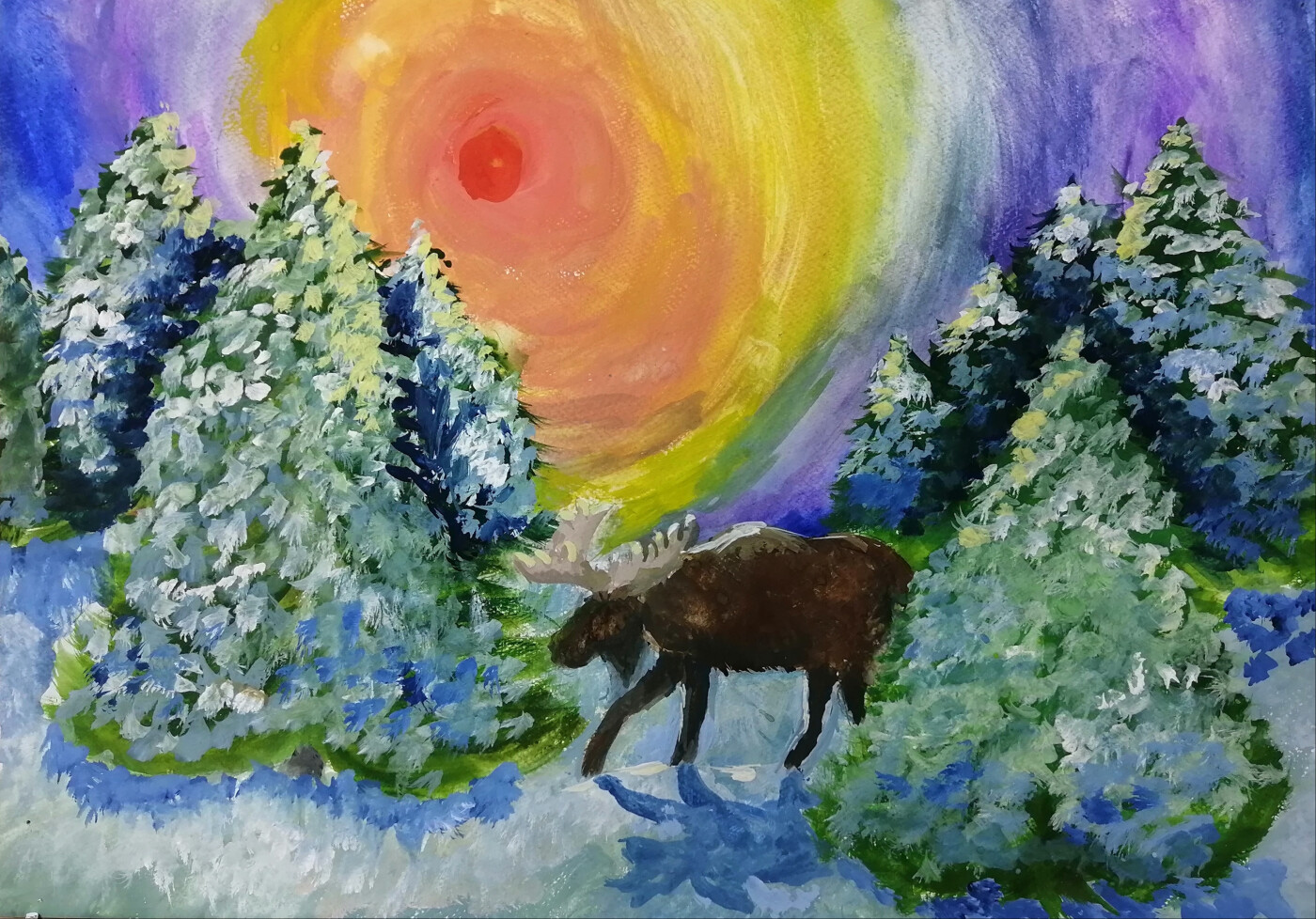 Зимой лес не пустует, можно встретить и такого гиганта, как лось. Зимовать ему не просто, поэтому иногда они заходят на окраину города. Люди помогают им - подкармливают лосей. Я увидела по ТВ, что лось зашел в город, и решила нарисовать его в своей привычной обстановке.