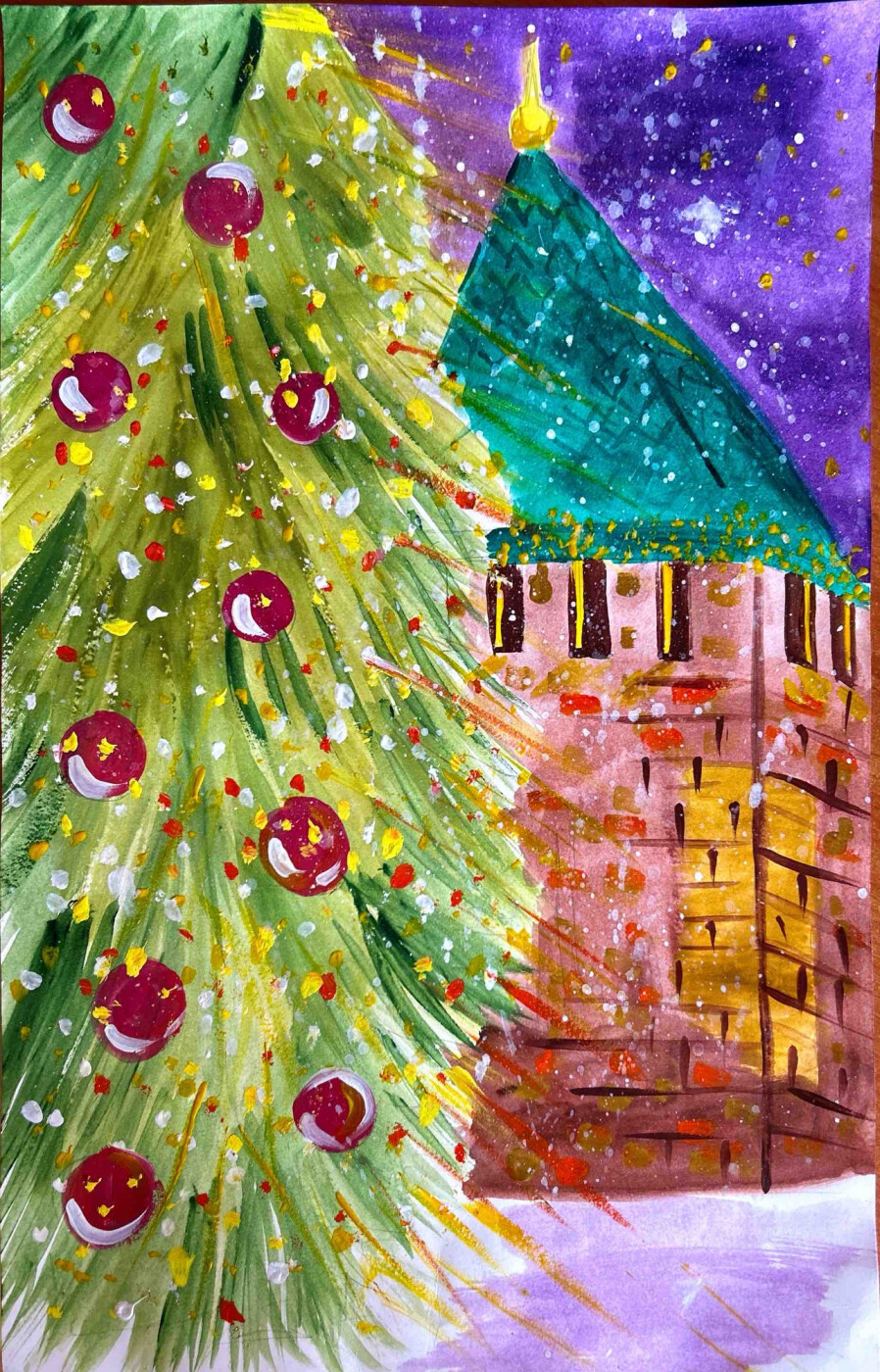 Эту работу меня вдохновила новогодняя сказочная ночь. Мне хотелось передать атмосферу праздника — мерцание огней на ёлочных игрушках, лёгкий снежок и тёплый свет из окон старинной башни. Я работала глубокой кистью по мокрой акварели, добавляя яркие акценты гуашью, чтобы подчеркнуть блеск игрушек и снежные блики.