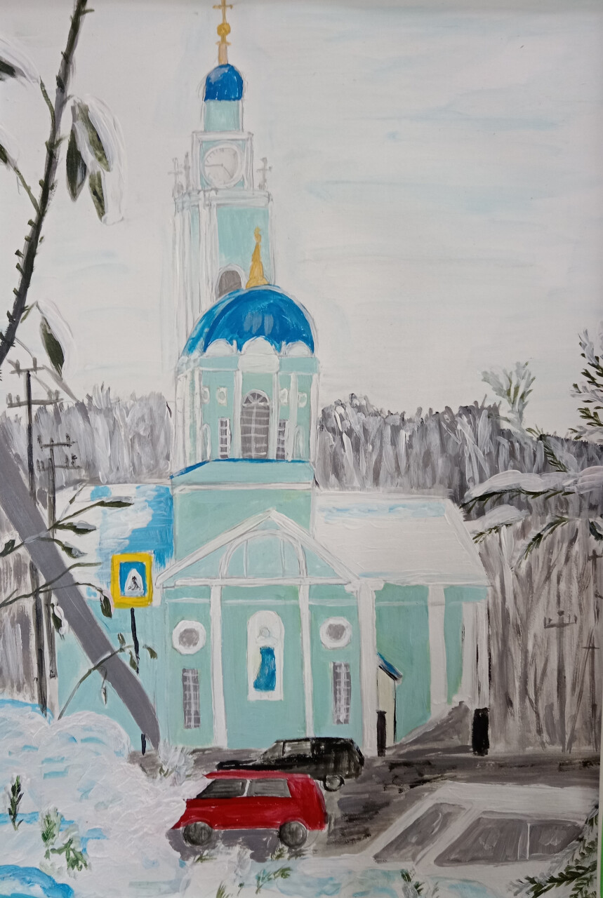 Мама рисовала купала природу, а я все остальное. У нас в городе стоит храм недалеко от моего дома, я иногда туда хожу с бабушкой, и вот однажды идём мы с ней ранним зимним утром и так солнышко светило на храм, что я решила сфотографировать этот момент, а затем нарисовали с мамой его, мне кажется что получилось здорово.