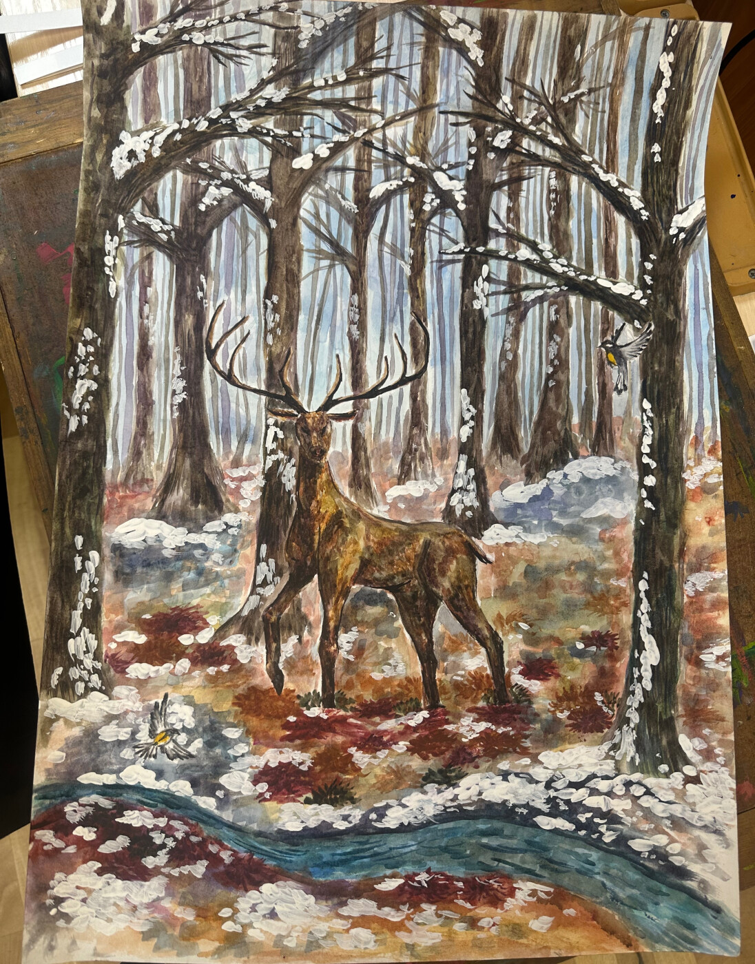 Манящий лес, красивая природа, деревья, которые рвутся в небо и лесные животные то, что заставляет человека любить свои родные просторы, однако не во все времена года. В своей картине я постаралась отобразить то время природы, когда многие считают его непривлекательным. Я приложила все усилия, чтобы показать обратное
